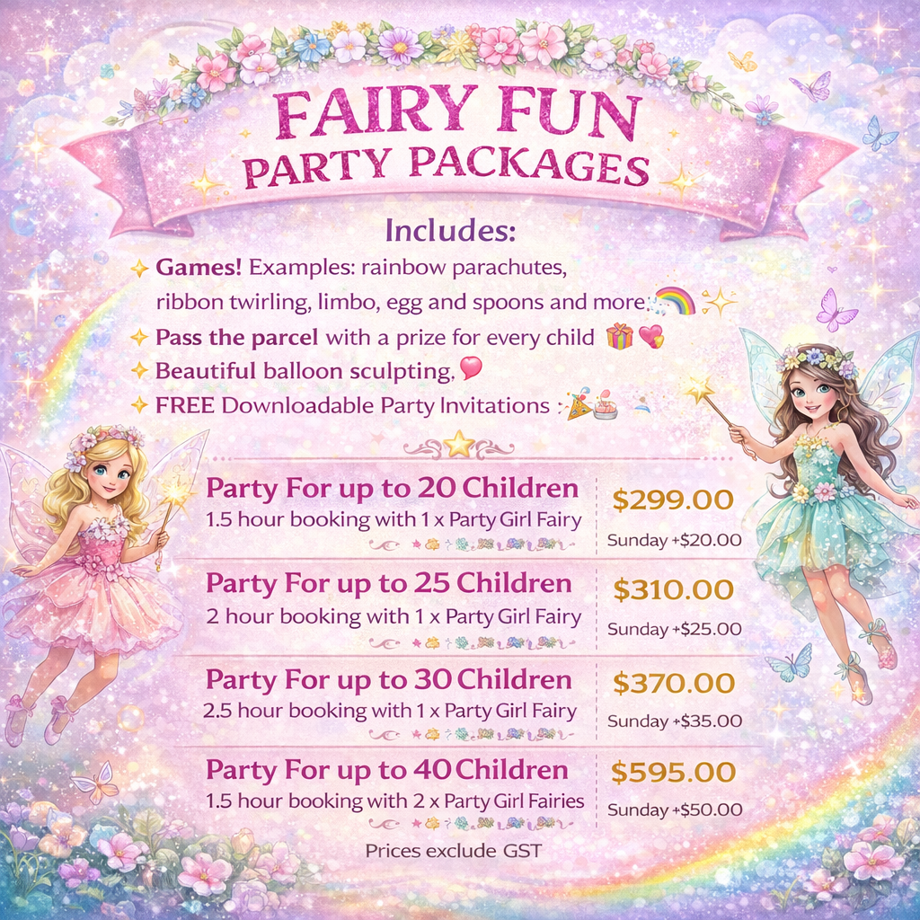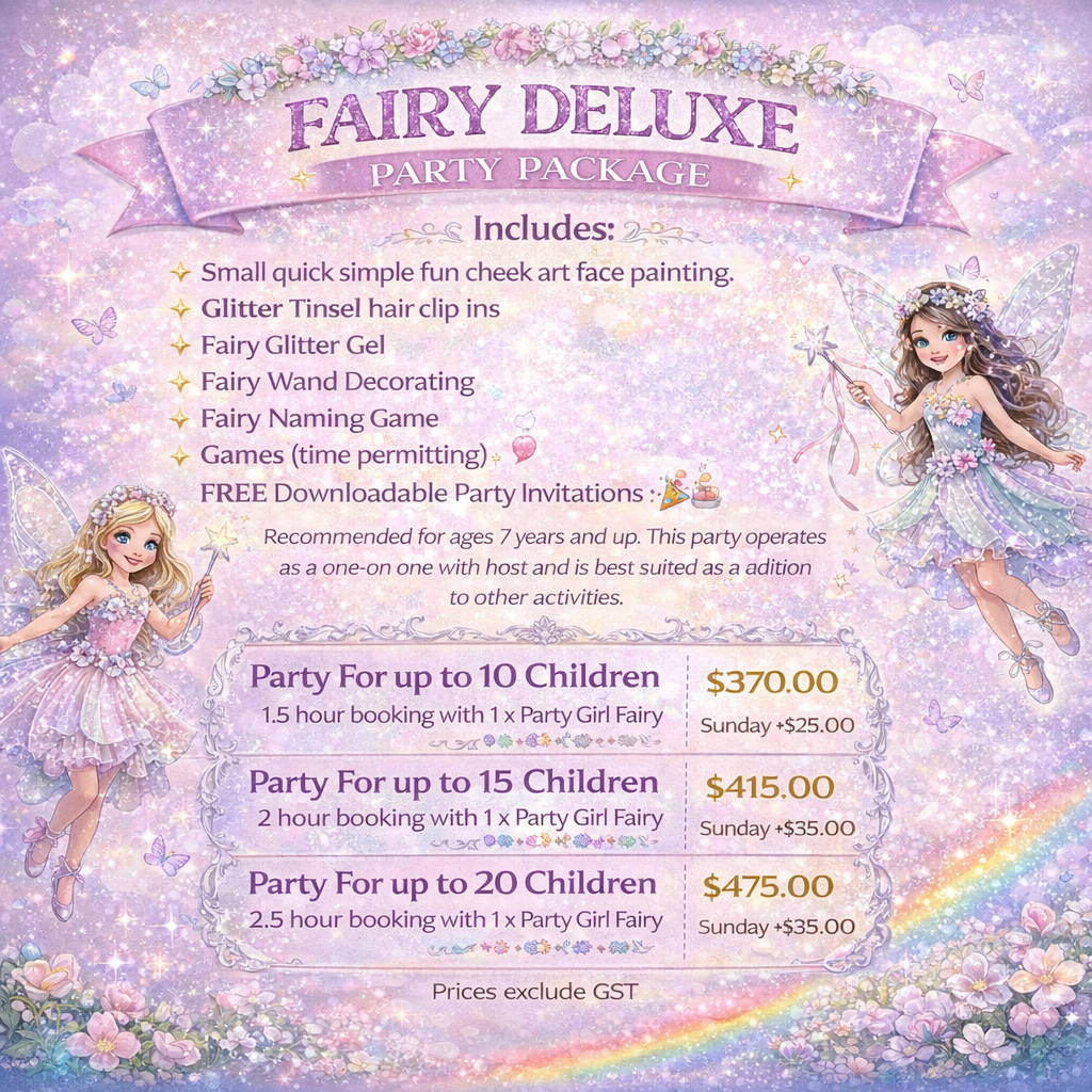Your Party Girl/s will arrive with a kit full of wishes, glitter & Fairy Fun!