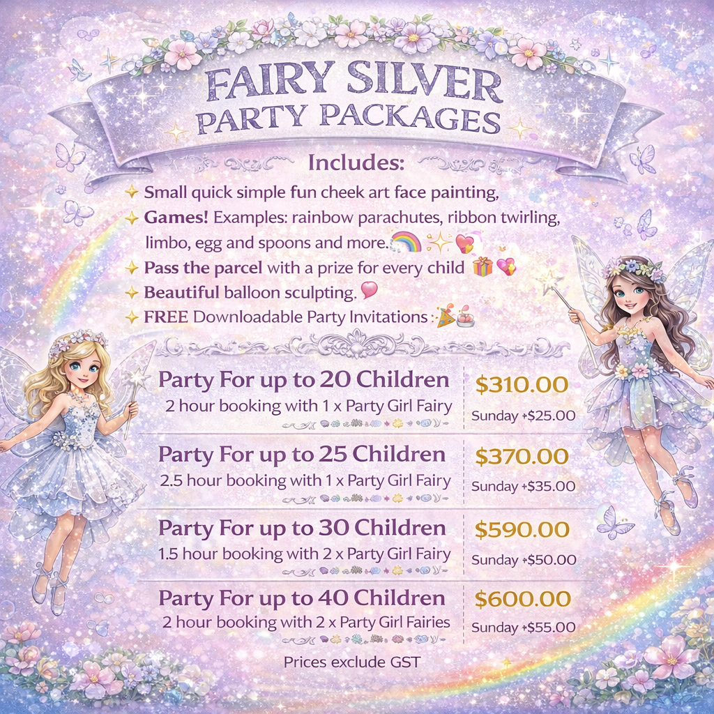 Our Fun & Silver Fairy Party Packages are Recommended for ages 4 or 5 years & up